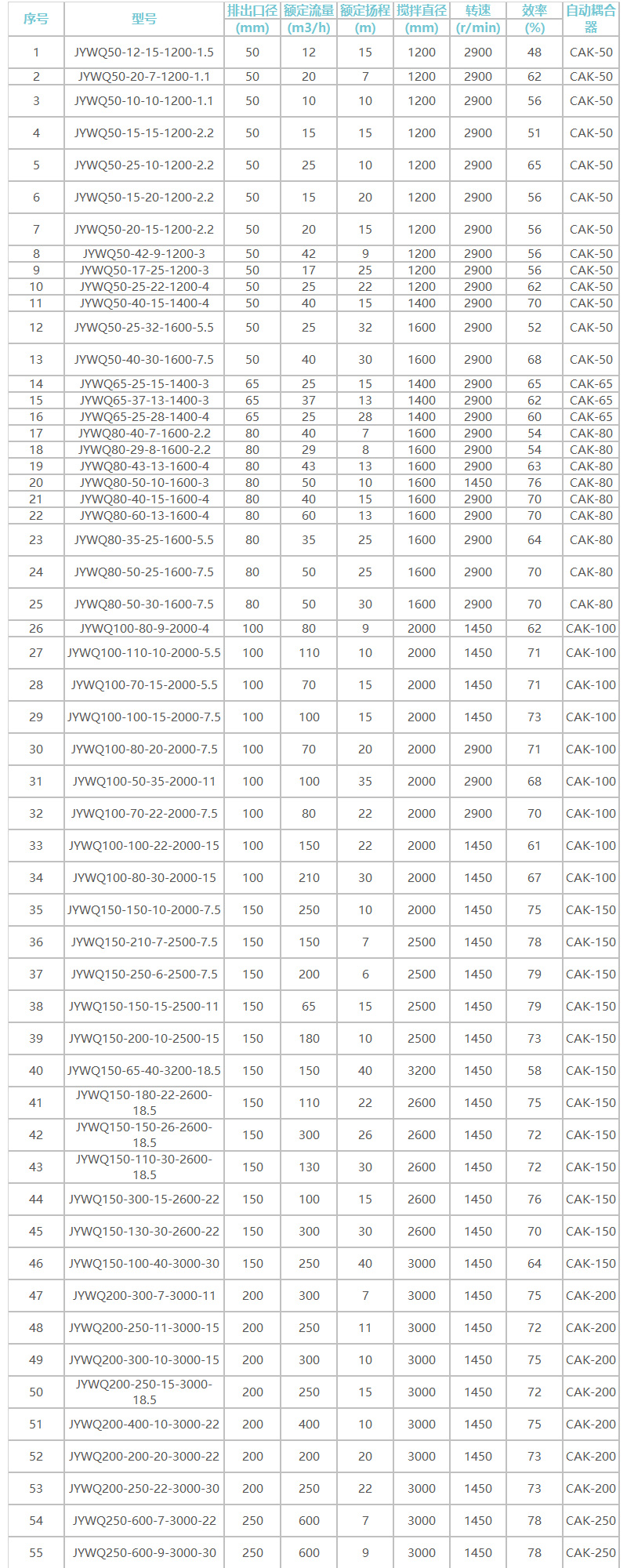 JYWQ型自動攪勻式潛污泵型號參數(shù):