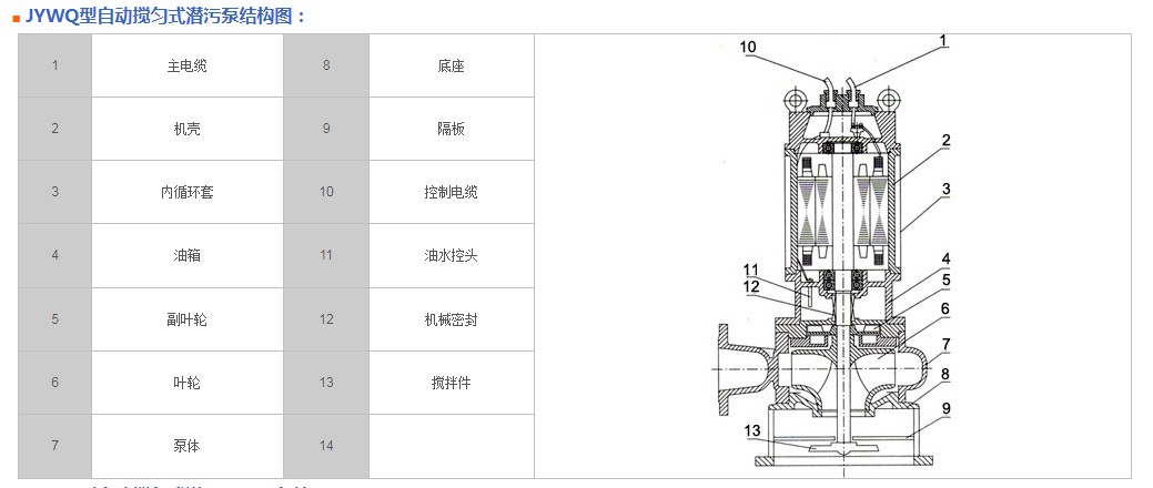 ■JYWQ型自動攪勻式潛污泵結(jié)構(gòu)特點說明: