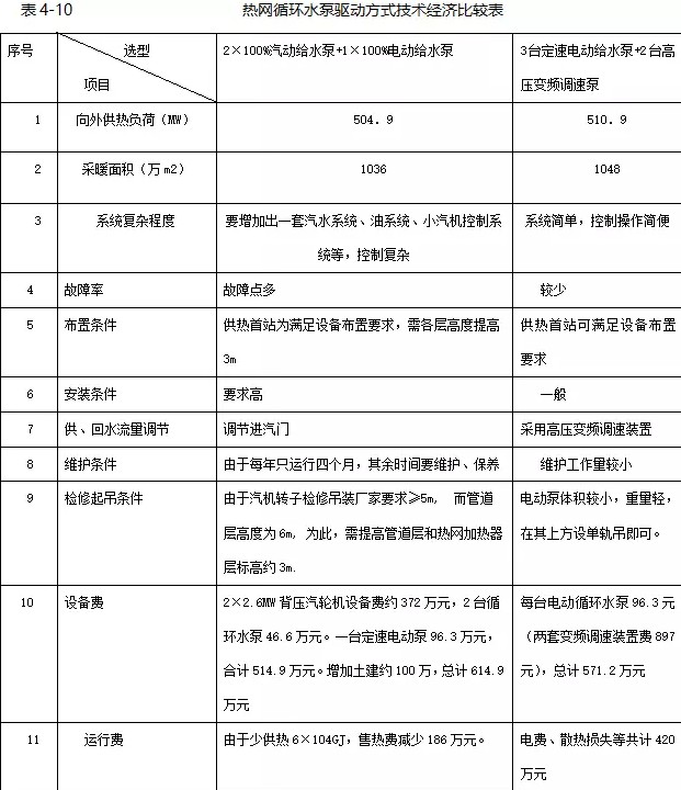 根據(jù)電動(dòng)和汽動(dòng)熱網(wǎng)循環(huán)水泵的結(jié)構(gòu)特點(diǎn),本研究針對(duì)兩個(gè)供熱首站的內(nèi)部情況進(jìn)行了布置,其技術(shù)經(jīng)濟(jì)比較見(jiàn)表4-10: